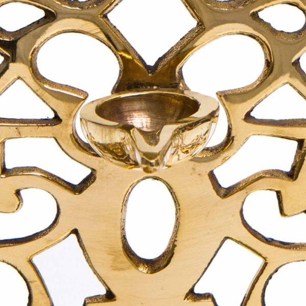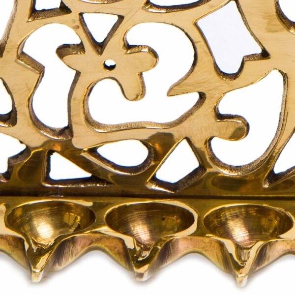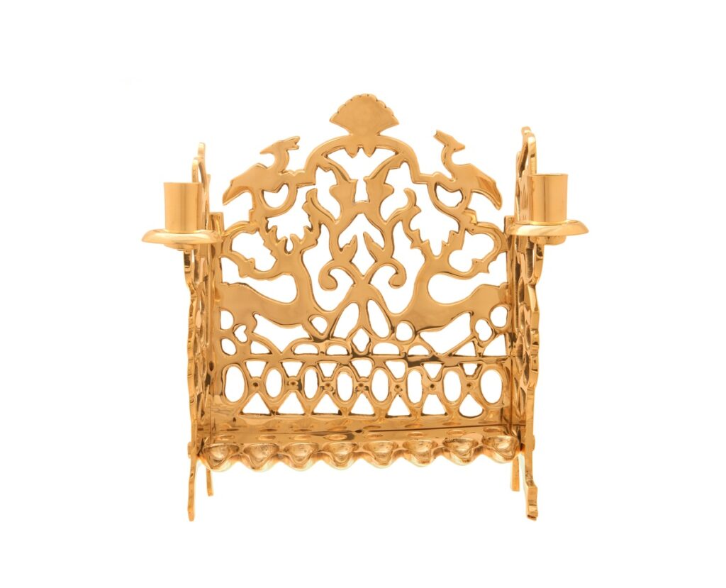 This Hanukkah lamp was inspired by some of the earliest Hanukkah lamps cast in metal in Spain and southern Italy. The ornate finial indicates that the lamps were meant to be hung on the wall. The early models were triangular in shape and their backplate was adorned with a symmetrical vegetal pattern. Over time this prototype evolved and its decorative design became richer and more elaborate.