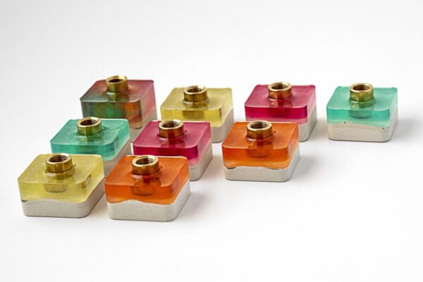 The cubes are made using a special concrete and epoxy resin cast set with brass candle holders. The lamp’s compact and elegant box optimally protects the units when not in use.