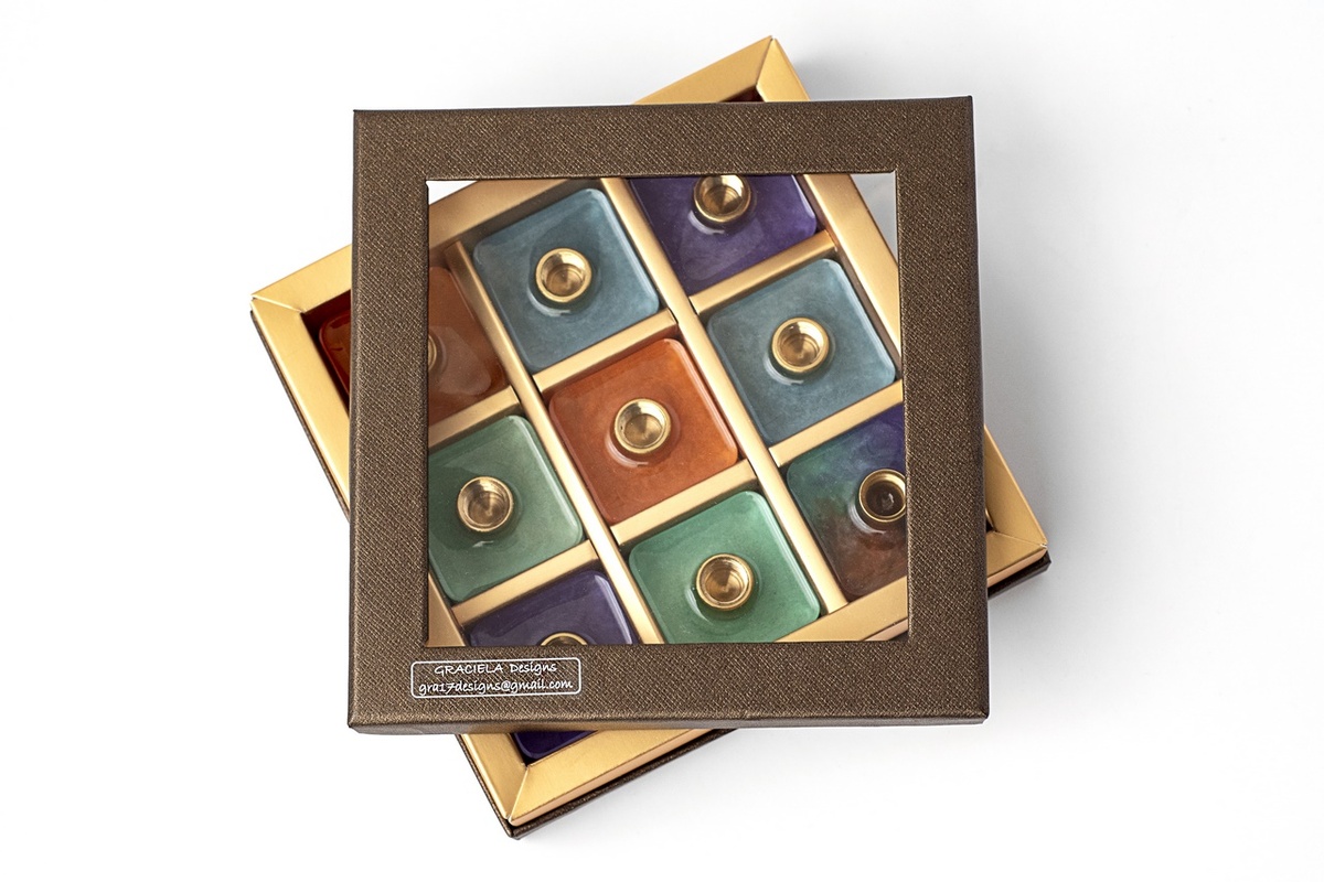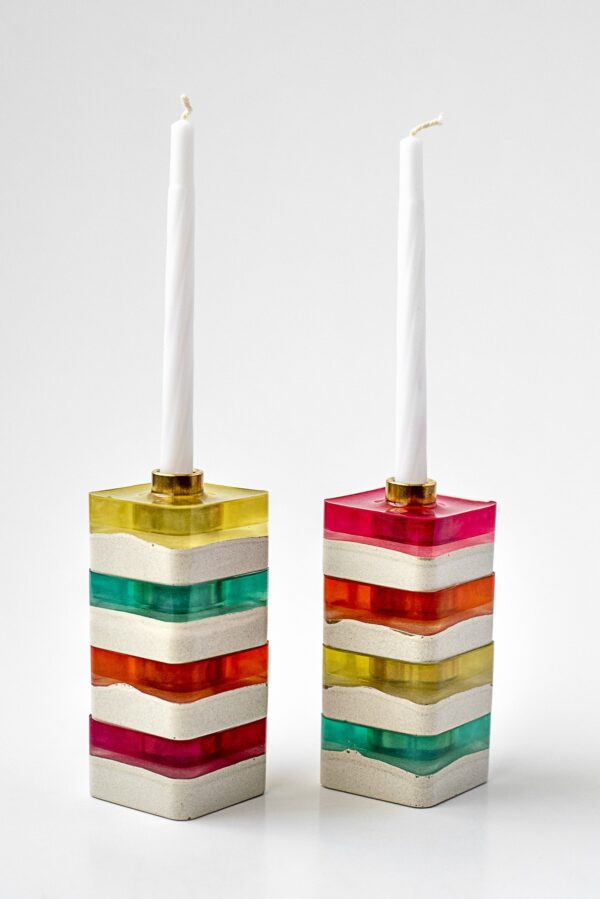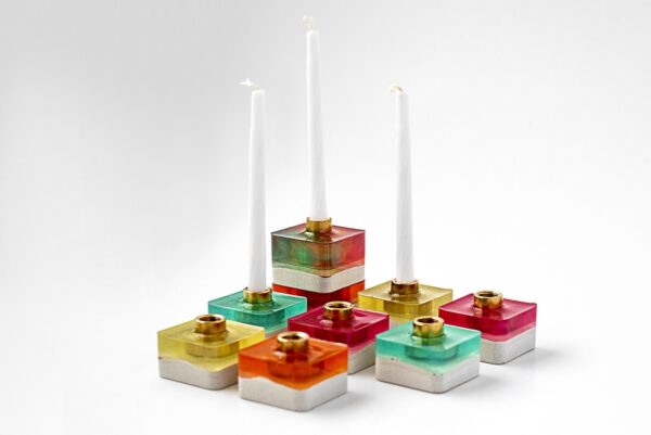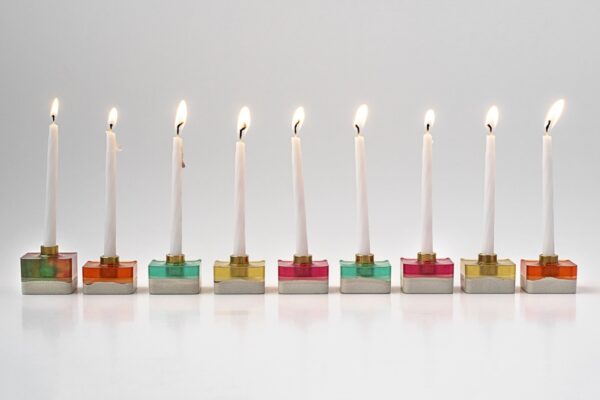 When not in use, the cubes (candle receptacles) can be stacked one on top of the other, creating a beautiful decorative tower. The lamp thus appears different on every night of the holiday, and can also be used throughout the year to light Shabbat candles.