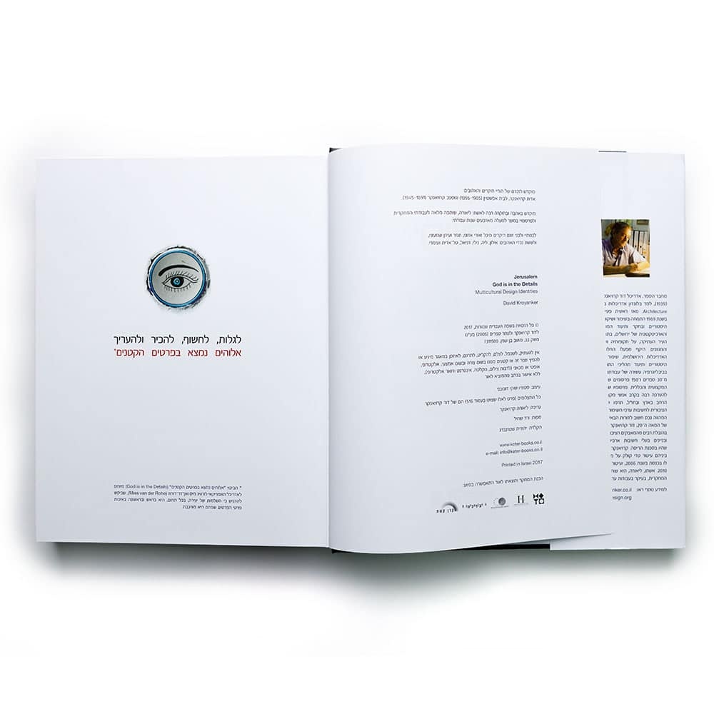 In this richly photographed volume, Architect David Kroyanker presents Jerusalem’s urban fabric from a detailed, design-oriented perspective, known only to aficionados. Jerusalem’s design idiom includes functional-engineering components, decorative elements, and symbols or forms that reflect the national, religious, and community traditions contributing to the city’s cosmopolitan, multi-cultural character. These gems – some of them hidden deep beneath the surface – allow the uninitiated to discover, learn, and appreciate the full meaning of the saying “God is in the details.”