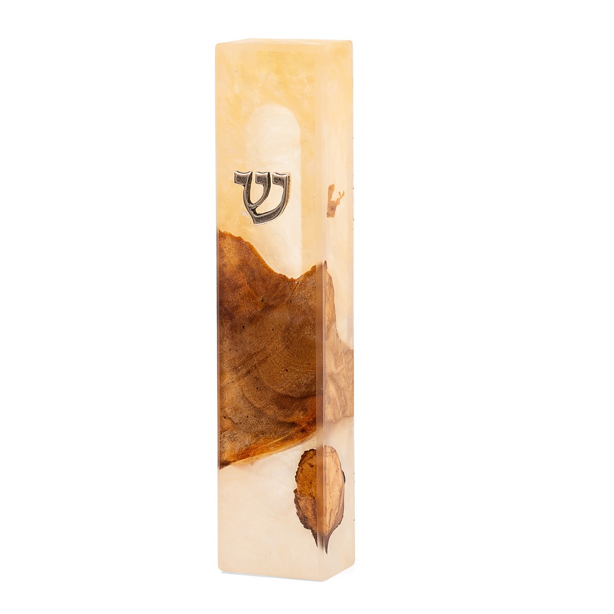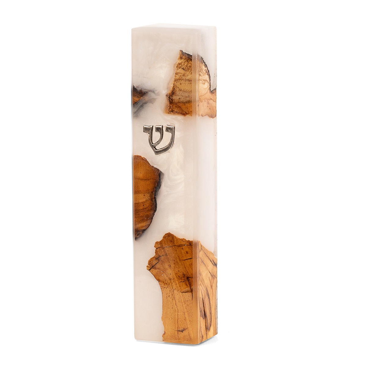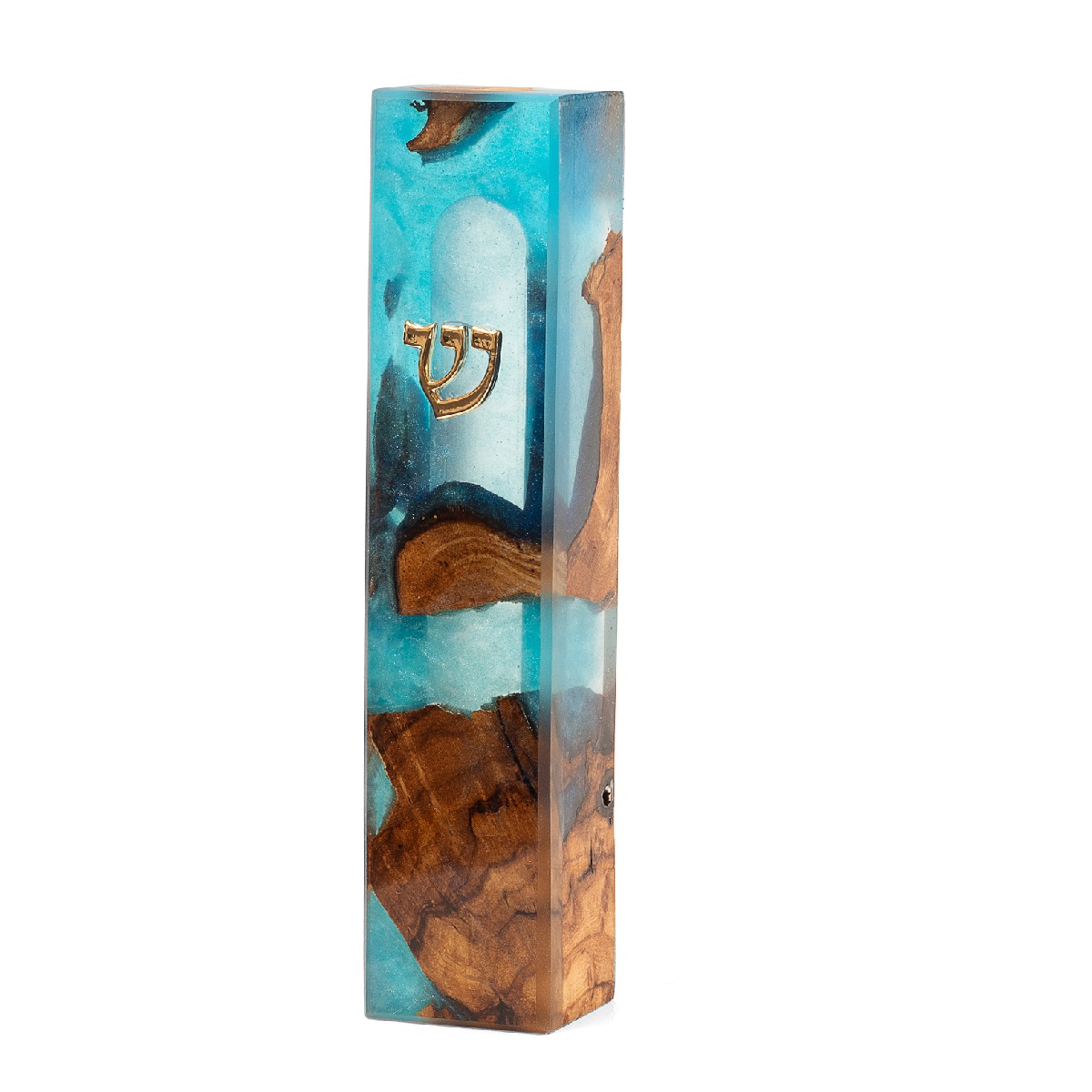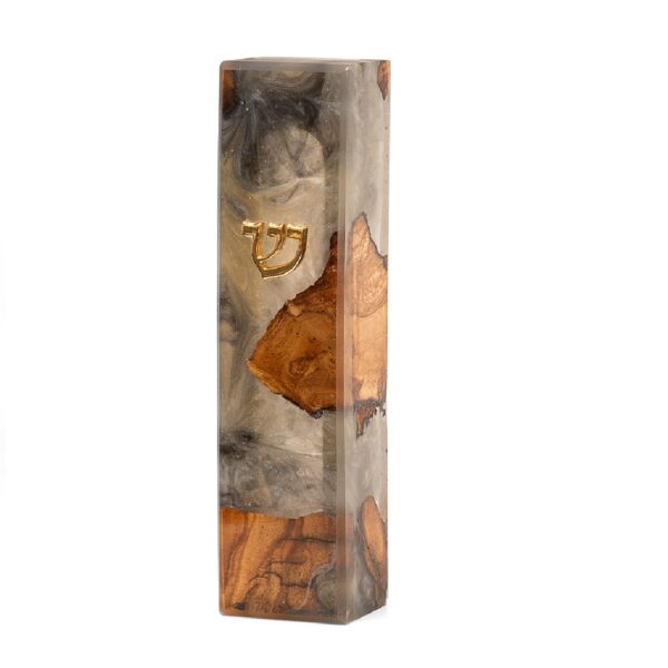 מזוזה בעבודת יד מחומר אפוקסי ועץ טבעי, עם אות "ש" מוזהבת.