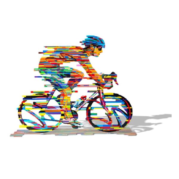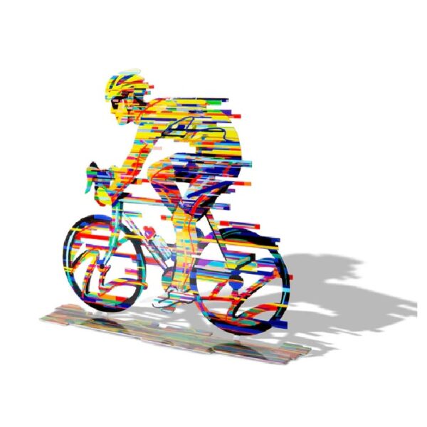 פסל צבעוני של רוכב אופניים מאת דוד גרשטיין. יצירה תלת־ממדית ממתכת חתוכה בלייזר, המציגה את הרוכב בתנועה דינמית תוך שימוש בקווים מקוטעים בצבעים עזים.