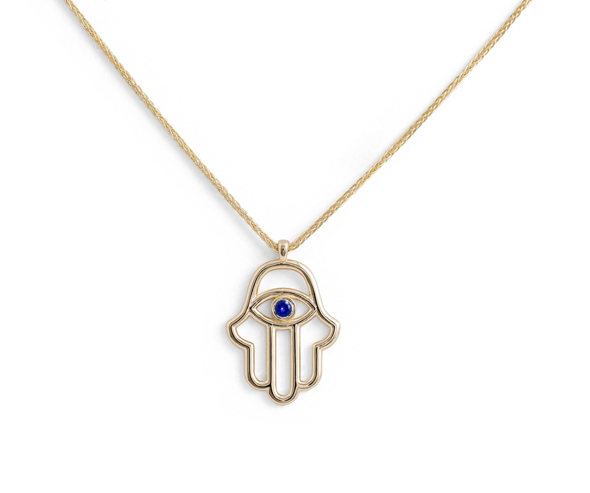 תליון חמסה זהב 14K בעיצוב פתוח ומעודן, עם עין מרכזית המשובצת אבן ספיר כחולה. החמסה כסמל עתיק להגנה וברכה, יחד עם העין והאבן המלכותית, יוצרים תכשיט שמפגיש בין מסורת, עוצמה ואלגנטיות שקטה.