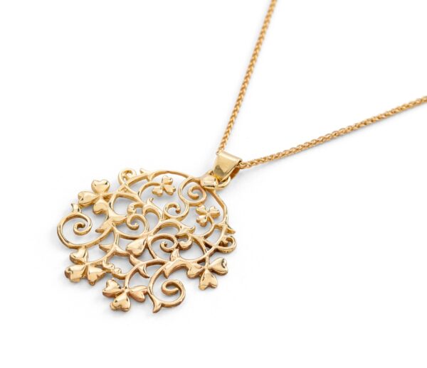 תליון תחרה מרהיב בעבודת צורפות מעודנת, בהשראת טבע מפותל ואלגנטיות קלאסית.