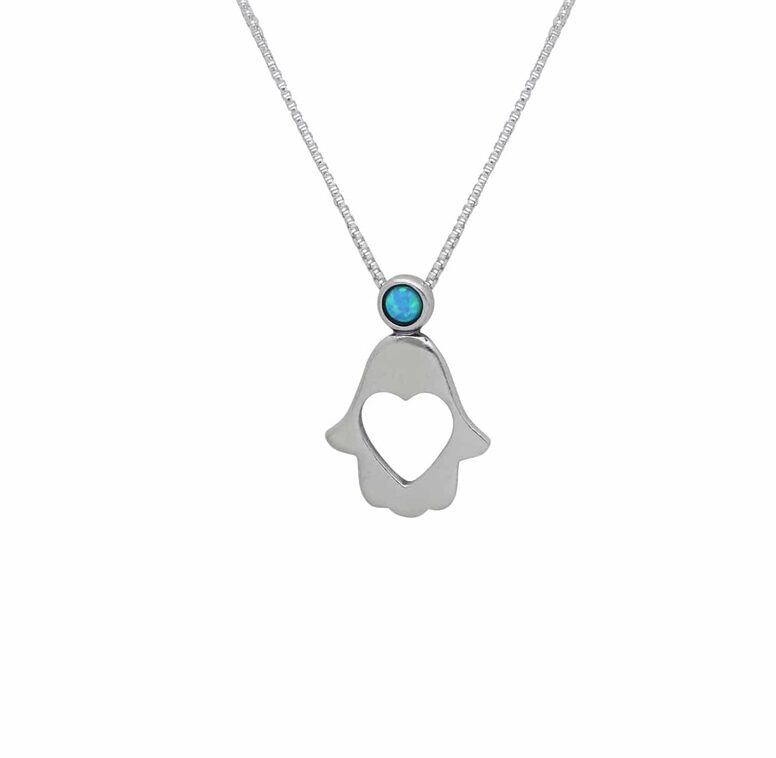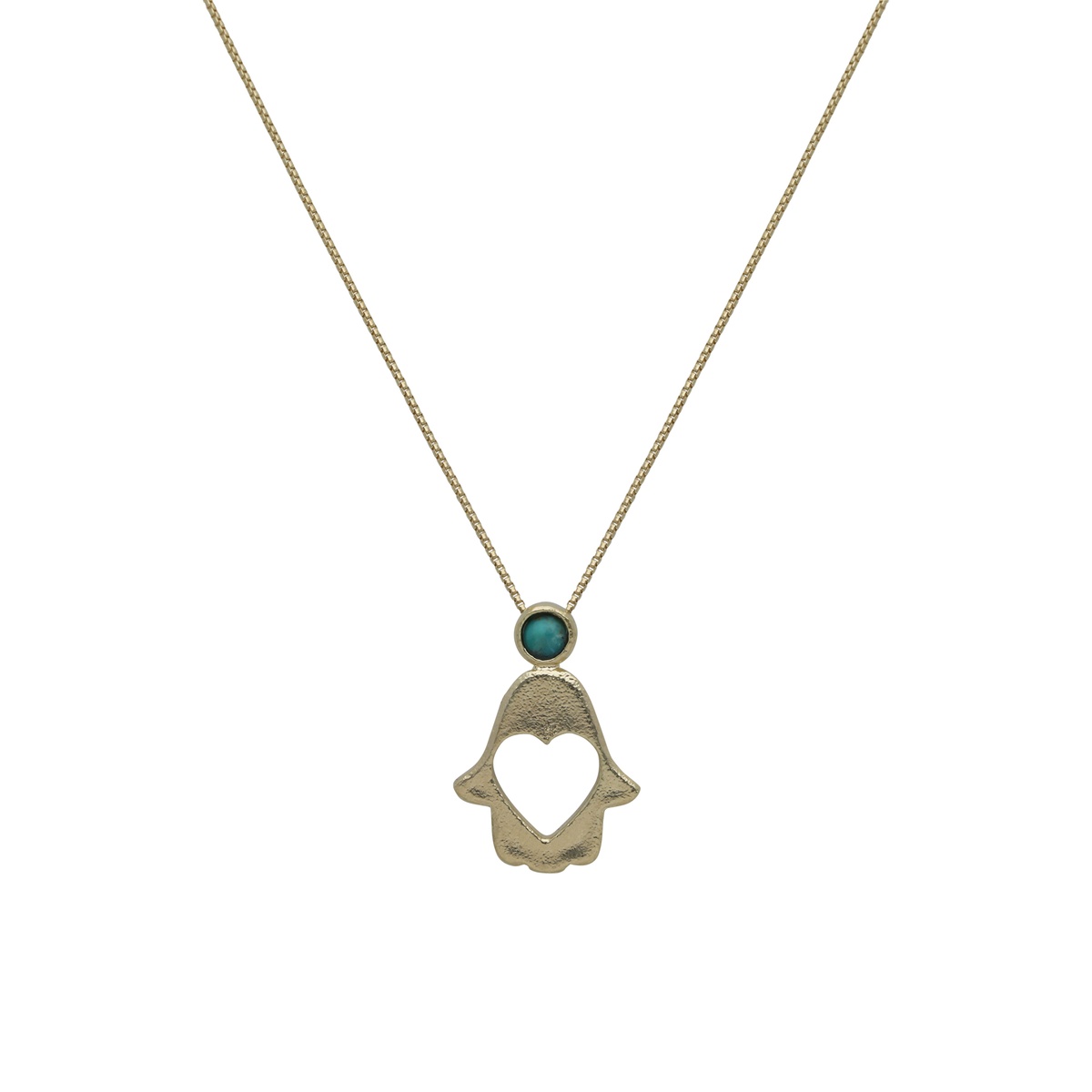 תליון חמסה עם לב פתוח ואבן טורקיז, עיצוב מינימליסטי שמאחד הגנה ואהבה. החמסה כסמל עתיק משרה תחושת ביטחון, בעוד הלב הפנימי והאבן מוסיפים רוך ואנרגיה חיובית.