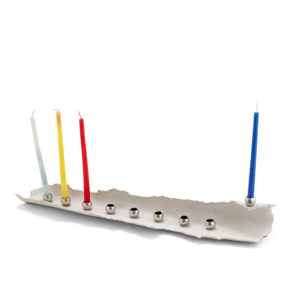 חנוכיית טבע בעיצוב דנה לוי היא יצירת אמנות עכשווית המשלבת מינימליזם עם חומרים טבעיים. החנוכייה עשויה קרמיקה לבנה עם גימור המדמה משטח קרוע מהטבע, ועליה בתי נר ממתכת כסופה המשתלבים בהרמוניה עם המראה האורגני. כל פריט מיוצר בעבודת יד, ולכן כל חנוכייה ייחודית ושונה בפרטים הקטנים שלה. עיצוב זה מתאים הן לשימוש בחנוכה והן כפריט עיצובי מרשים לבית, שמעניק נגיעה של טבע ואותנטיות לחלל.