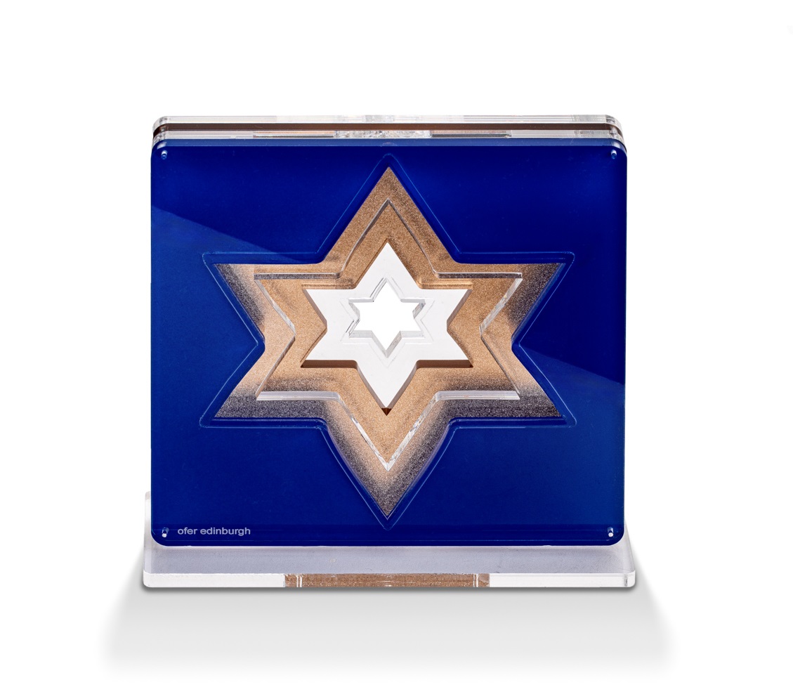 יצירת זכוכית מרובעת בגוון כחול עמוק עם מגן דוד תלת־שכבתי