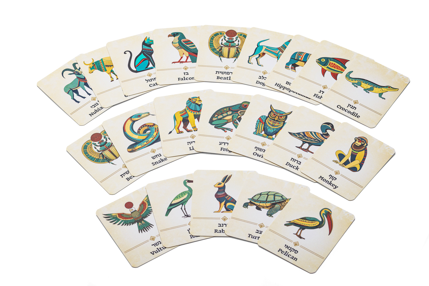במשחק 21 זוגות קלפים עם איורים מקוריים של בעלי־חיים במצרים העתיקה ושמותיהם בעברית ובאנגלית.