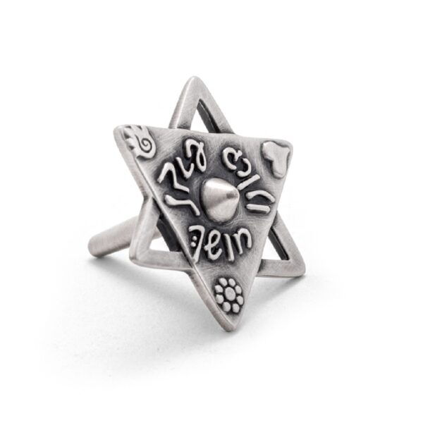 העיצוב משלב בין מגן דוד קלאסי לעיטור פרח עדין שבמרכזו האותיות נ – ג – ה – פ.