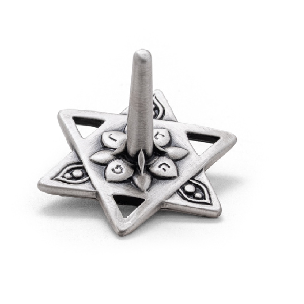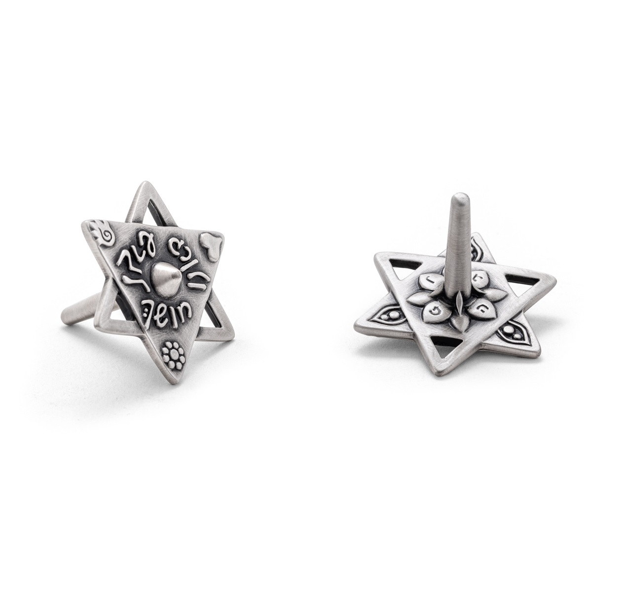 סביבון חגיגי לחנוכה, עשוי מתכת יצוקה ומצופה כסף טהור – הכי קרוב לסביבון המסורתי שאהבנו.