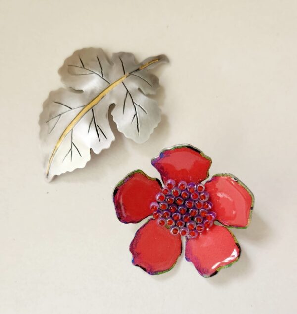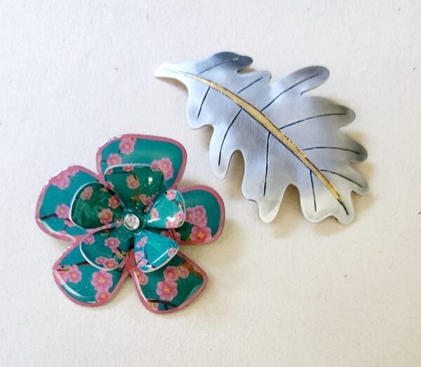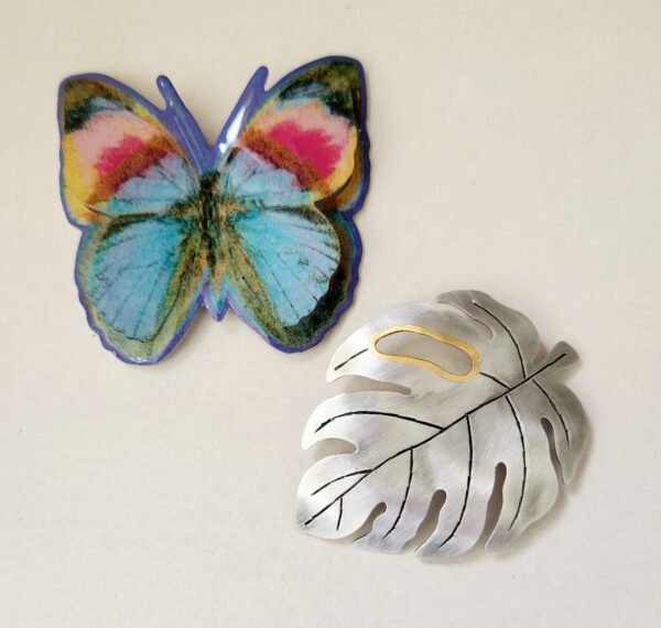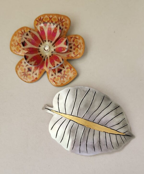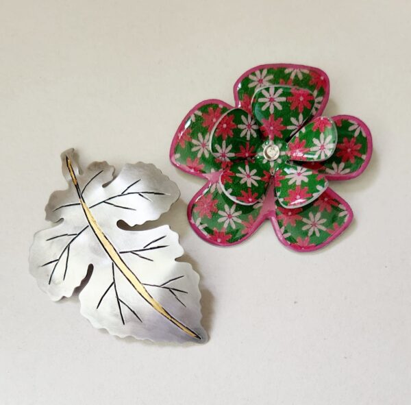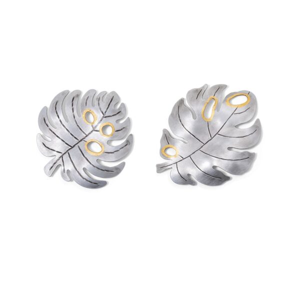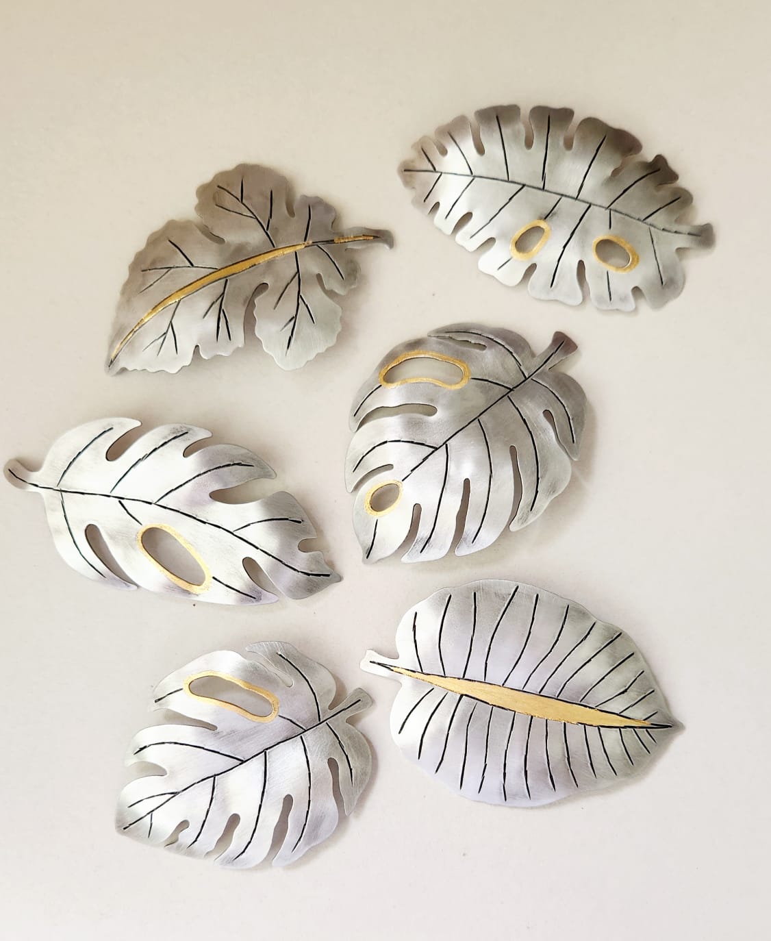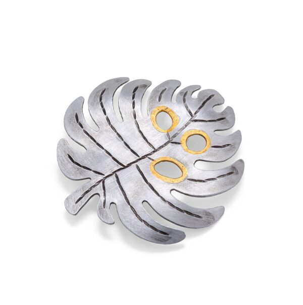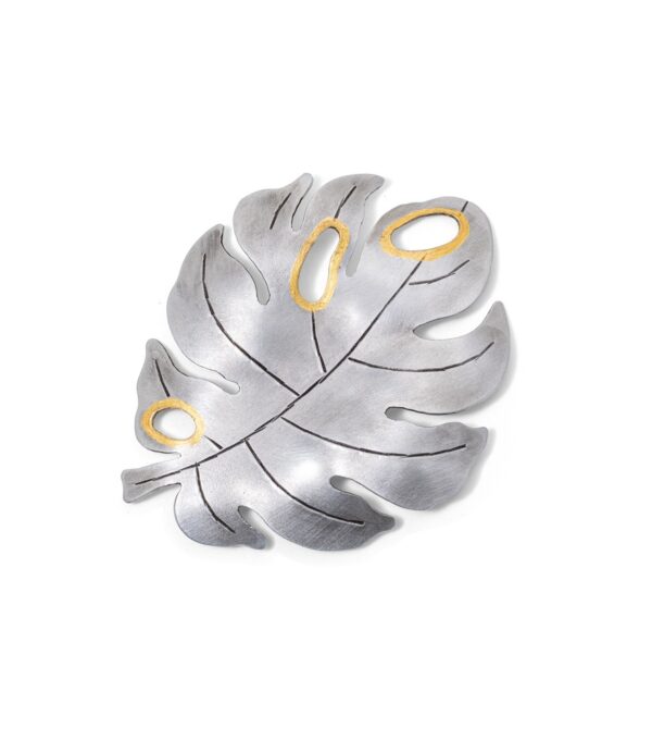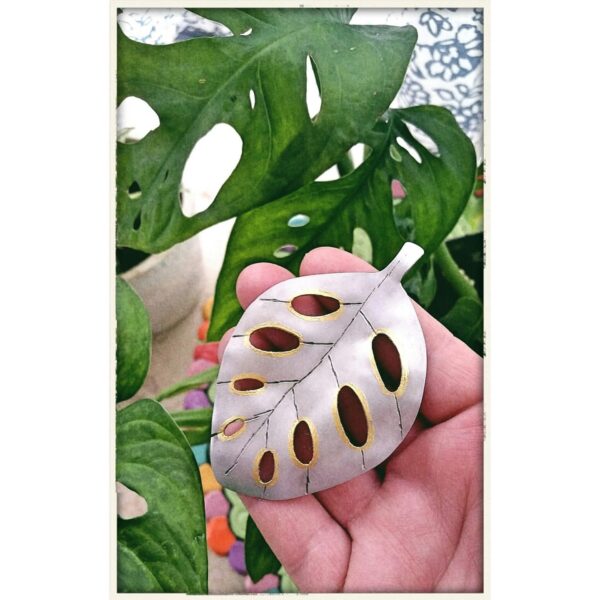 סיכת דש בעיצוב עלה מונסטרה עשויה אלומיניום בעבודת יד, עם נגיעות זהב שמוסיפות אור ואלגנטיות.