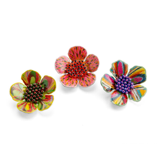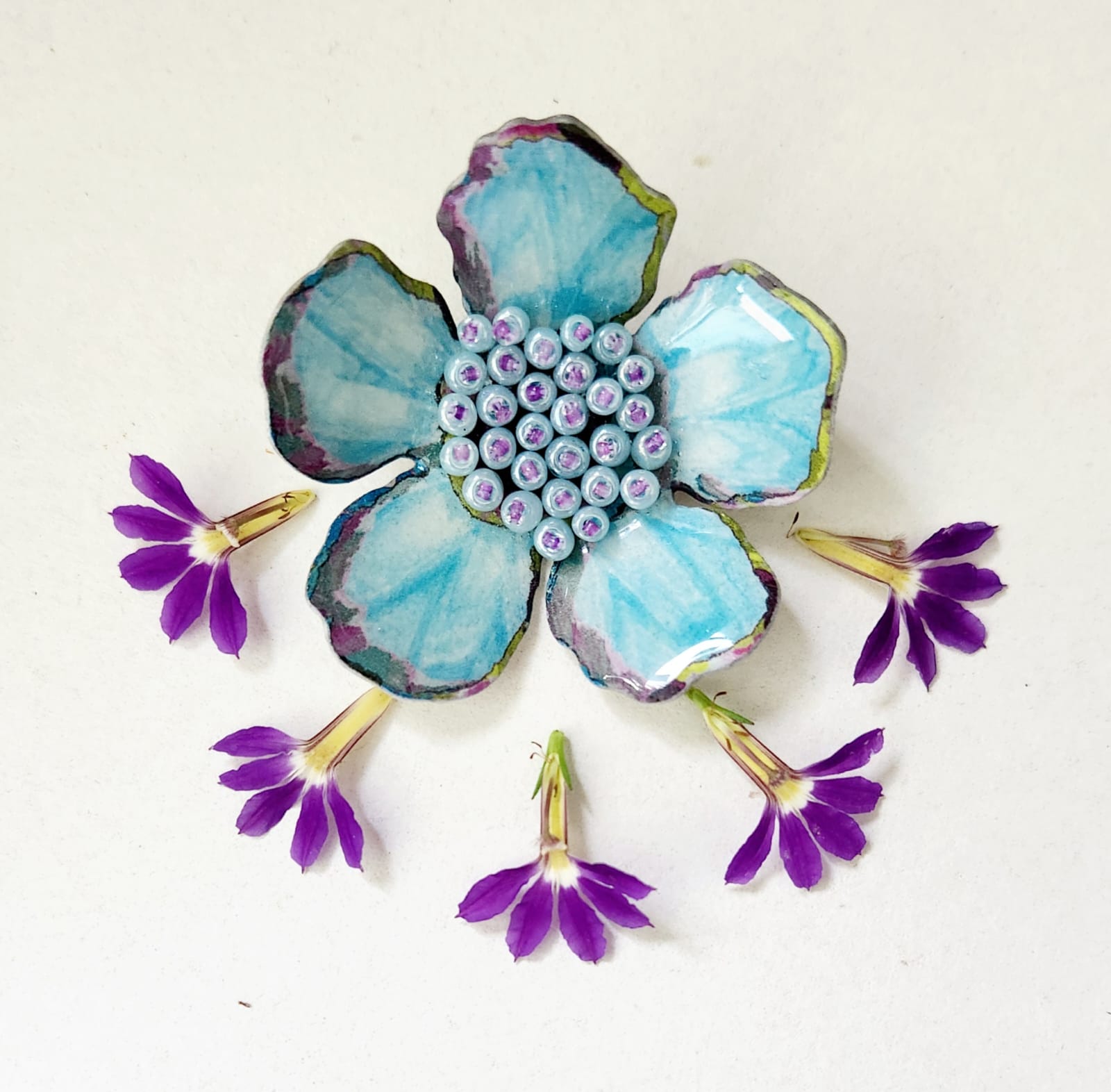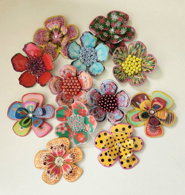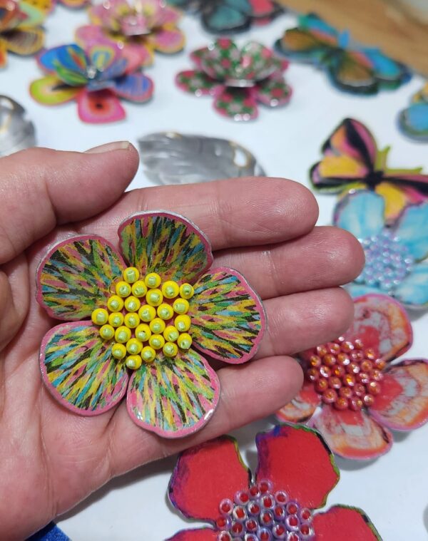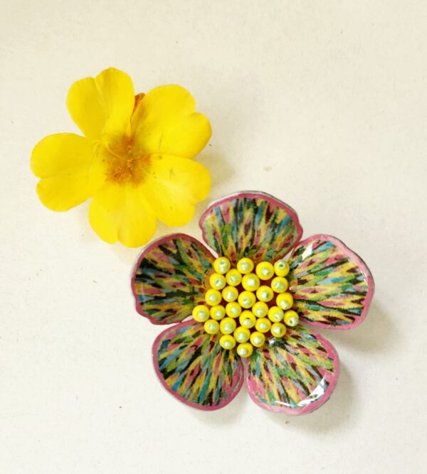 סיכת פרח בעיצוב איריס אוליבר, עשויה מחומרים צבעוניים בטכניקה ייחודית.