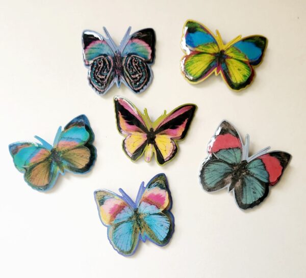 סיכת פרפר צבעונית בעיצוב מקורי של איריס אוליבר. כל סיכה היא ייחודית, כאשר הגוונים משתנים לפי המלאי.