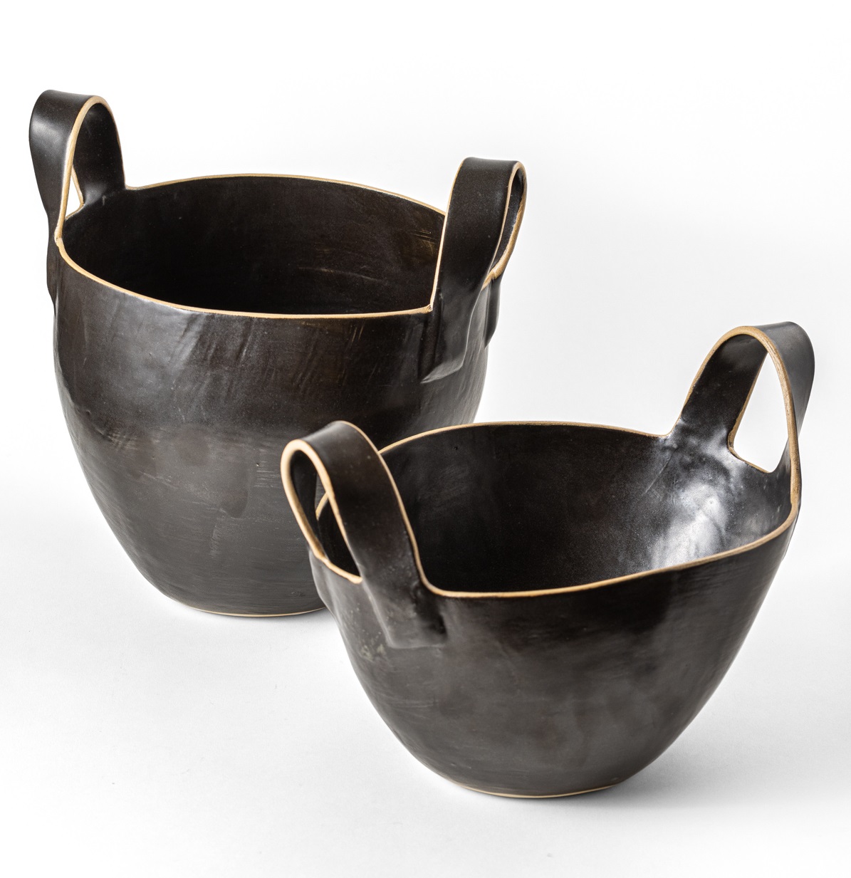 קערות קרמיקה שחורות בעבודת יד עם ידיות ארוכות ומסגרת בהירה עדינה.