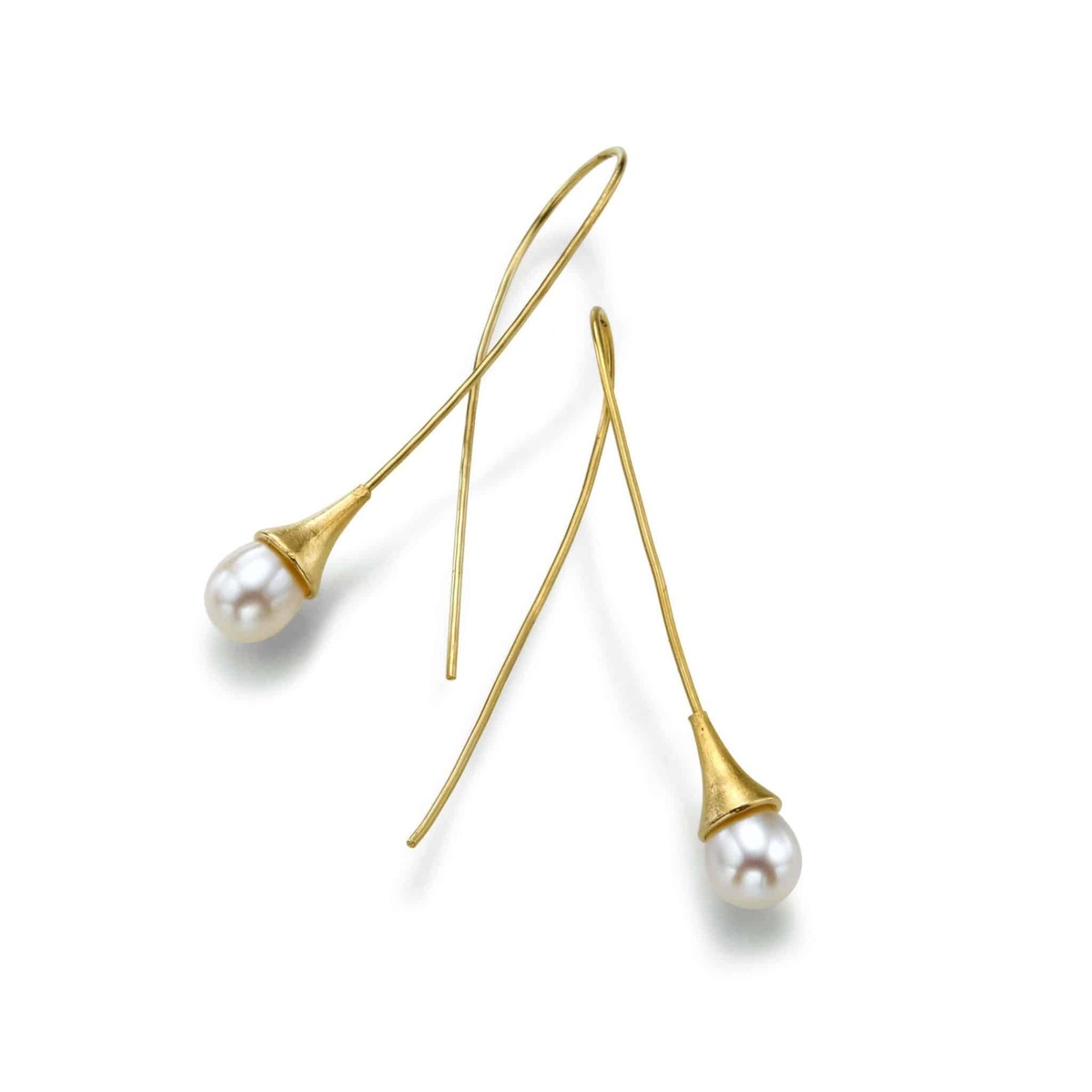 עגילי הזהב של שרגא ארד מעוצבים בקו מינימליסטי־אלגנטי ומשלבים פנינים טבעיות שמשתלשלות בעדינות מתוך קונוס מוזהב. העיצוב הנקי מדגיש את חומרי הגלם האציליים ומחבר בין פשטות צורנית לאצילות קלאסית.