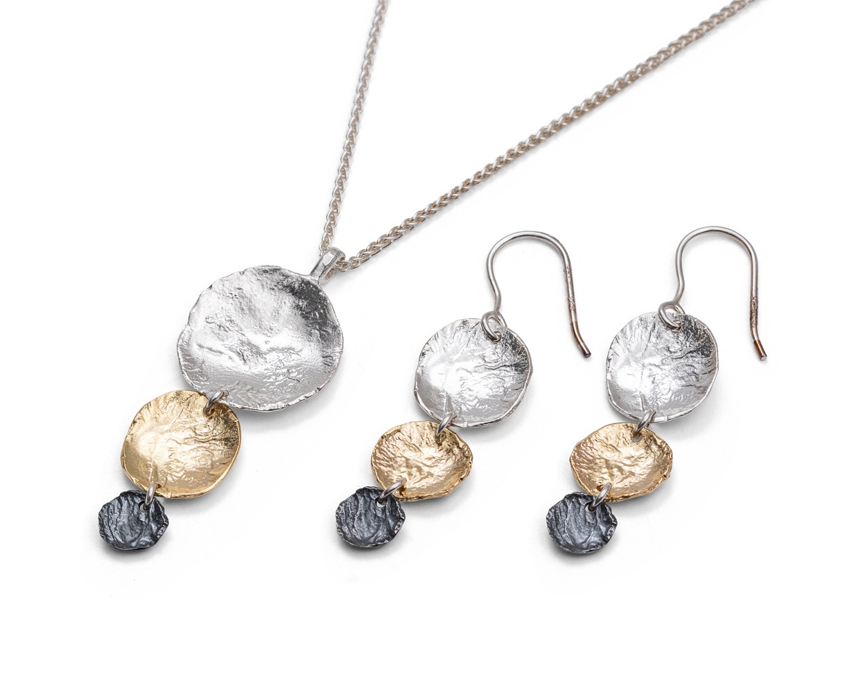 שרשרת מעוצבת בעבודת יד עם תליון משלושה עיגולים בגוונים מתכתיים משתלבים