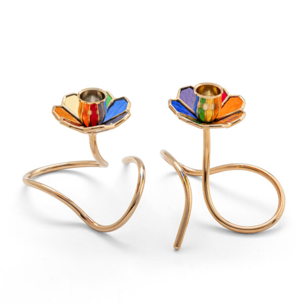 זוג פמוטים בעבודת יד בעיצוב מקורי של האמן אלי ישר. עשויים ויטראז' זכוכית אמייל צבעונית ובסיס מתכת בציפוי זהב.