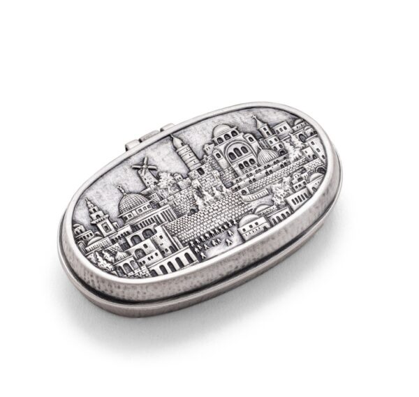 על הקופסה מוטיב חקוק של נוף ירושלים יובתוכה ברכת "לכה דודי".