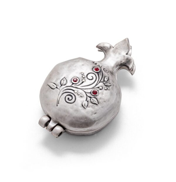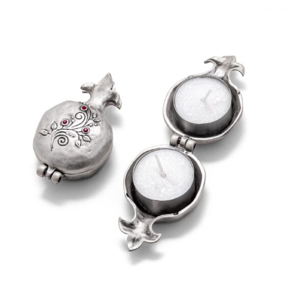 סט פמוטים מתקפלים לשבת בעיצוב רימון מהודר, מצופה כסף טהור ומשובץ בקריסטלים אדומים. הפמוטים נפתחים מתוך קופסה קומפקטית – פתרון מושלם לנסיעות, טיולים או חיים בחו"ל.