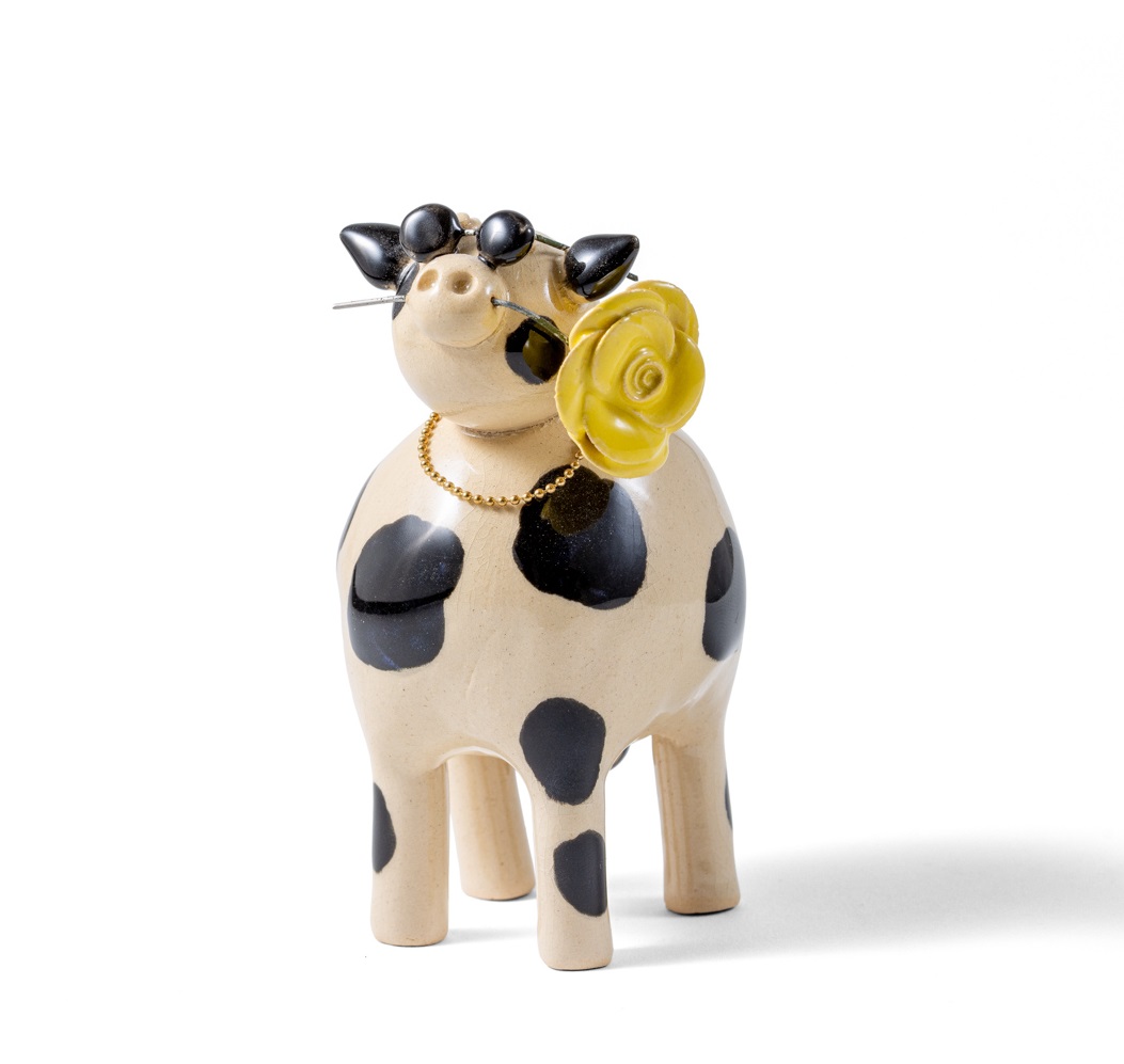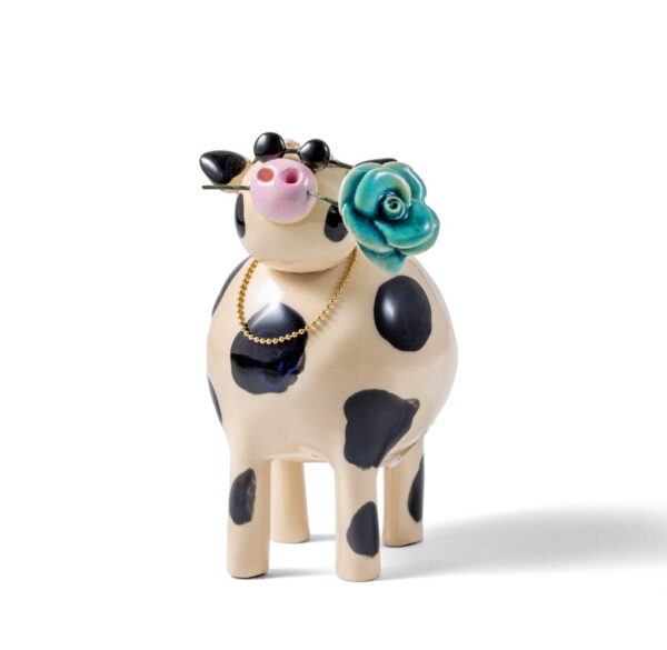 פרות פורצלן בעבודת יד, עם קריצה של הומור ושיק כפרי ישראלי. כל אחת מהן מעוצבת בעבודת יד על ידי האמנית טלי רסלר, נושאת פרח צבעוני בפיה (הצבע משתנה לפי זמינות במלאי), ועונדת שרשרת עדינה – שילוב מושלם בין שובבות, סטייל ונשמה.
