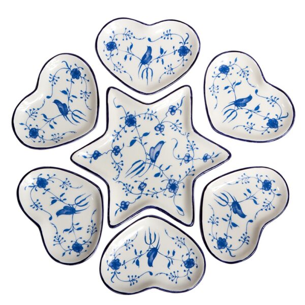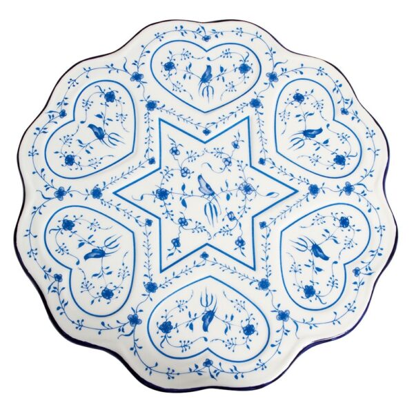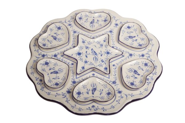 קערת הסדר שעוצבה בסגנון חרסינה (פורצלן סיני) הניכר בעיטור הכחול על רקע לבן ובמבחר המוטיבים העדינים המצוירים עליה. יש בה שבעה שקעים; במרכז – בדגם מגן דוד, ובצדדים בצורת לב, התואמים לצלוחיות והן נועדו כולן לקערת הסדר המסורתית.