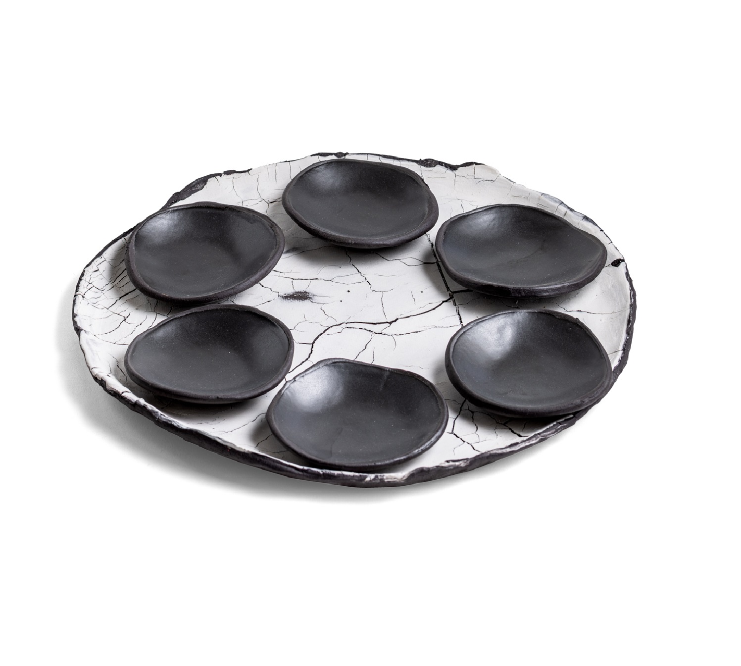 צלחת פסח ייחודית בעבודת יד, עם מראה טבעי ומרקם סדוק בגווני שחור־לבן