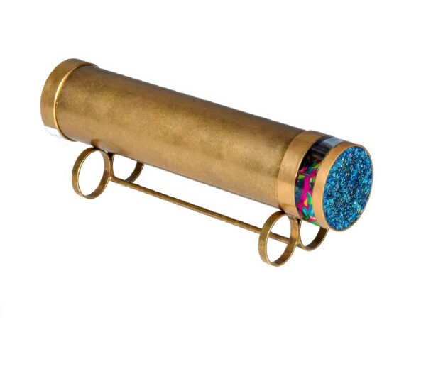 גוף הקליידוסקופ מצינורות פליז מלוטשים בגימור עתיק. מגיע עם מעמד יפה ואיכותי מפליז.