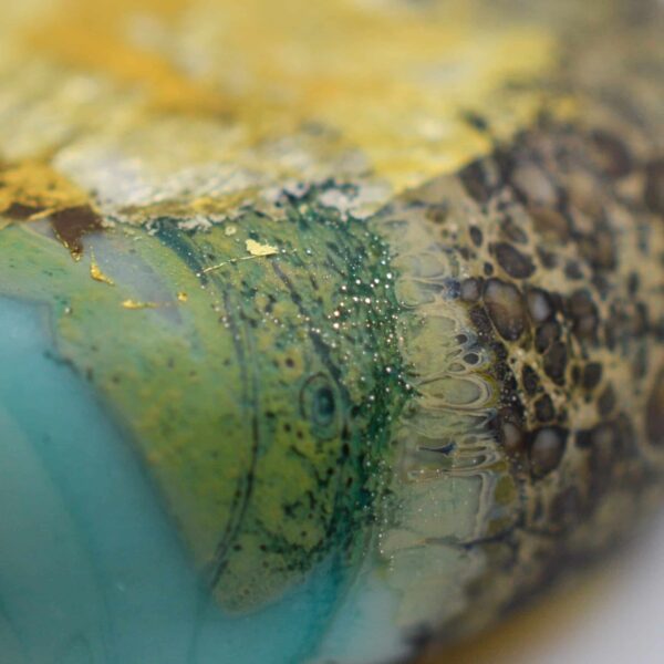 בטכניקות מיוחדות של פיסול ועיבודי חומר מזכוכית בשילוב עלי זהב 24 קראט,