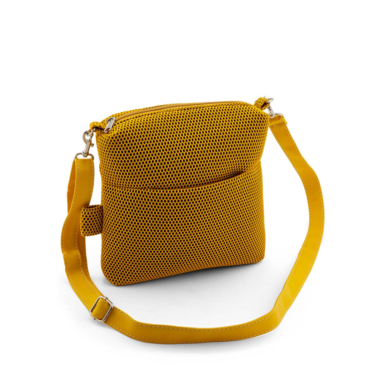 תיק צד אופנתי עם נוכחות צבעונית, עשוי בד מרושת בגוון צהוב עז בשילוב רצועת כתף מתכווננת תואמת.